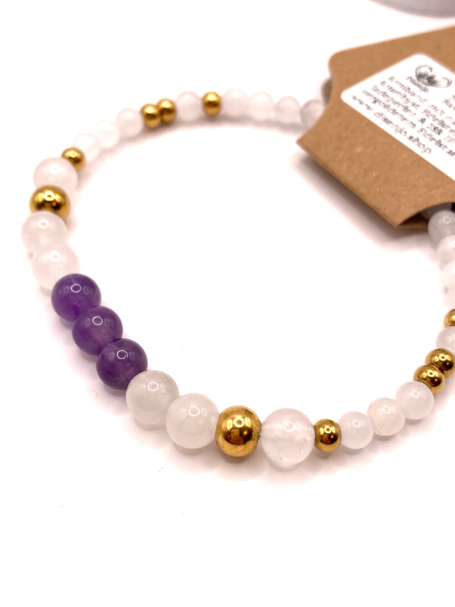 Die tiefvioletten Amethyststeine strahlen nicht nur in ihrer faszinierenden Farbe, sondern sind auch für ihre beruhigenden und schützenden Eigenschaften bekannt. Sie fördern innere Ruhe und Klarheit – ideal für den hektischen Alltag. Die weiße Jade hingegen symbolisiert Reinheit und Harmonie. Ihre sanften, milchigen Töne ergänzen die lebendige Farbe des Amethysts perfekt und schaffen eine harmonische Balance.