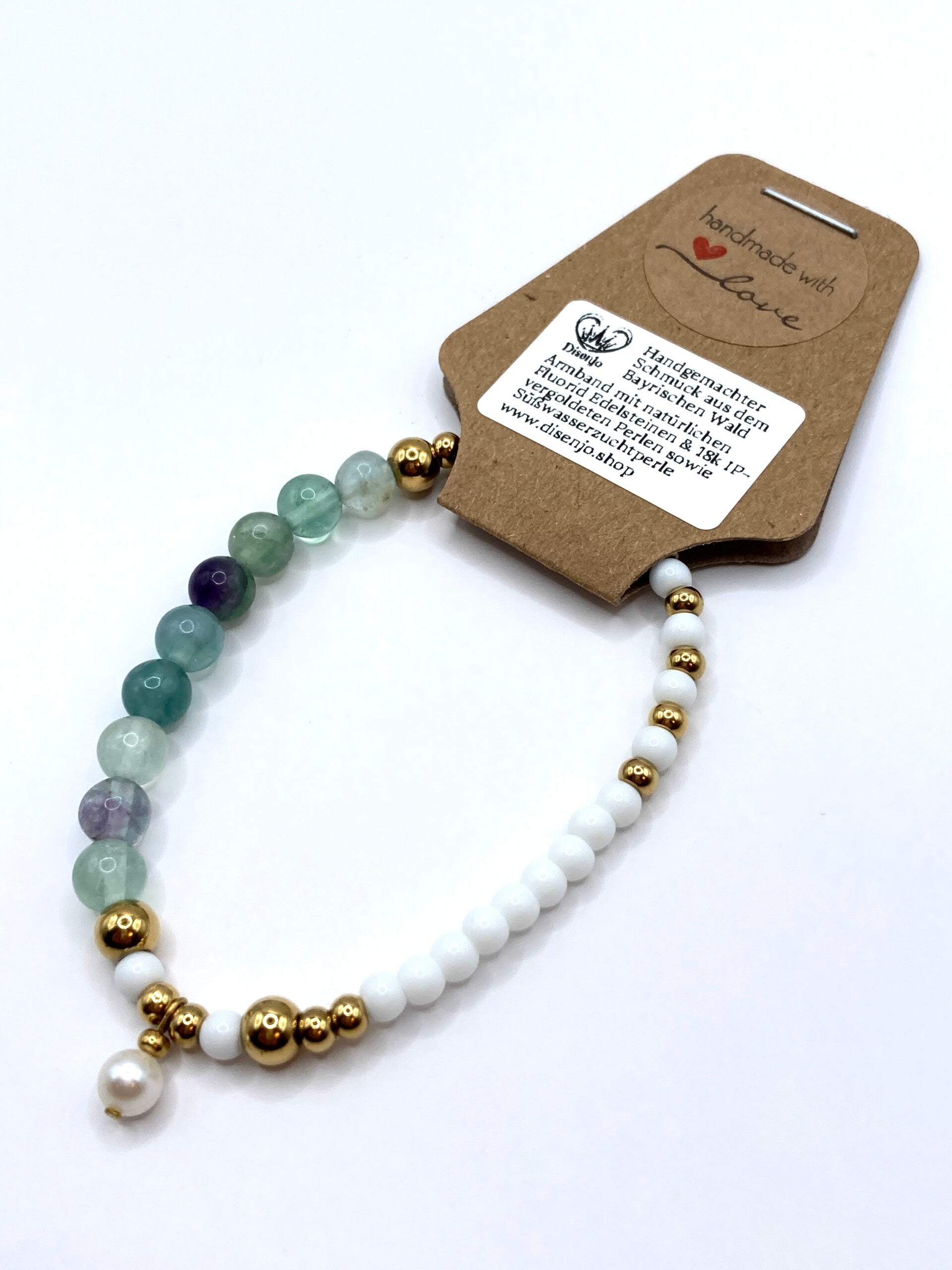 Die natürlichen Fluorid Edelsteine bringen eine faszinierende Farbvielfalt in sanften Grüntönen, teils mit leichten Violettstichen, die für ihre beruhigenden und klärenden Eigenschaften bekannt sind. Die hochwertigen weißen Glasperlen der Klasse AAA setzen einen eleganten Akzent und verleihen dem Armband eine zeitlose Note.