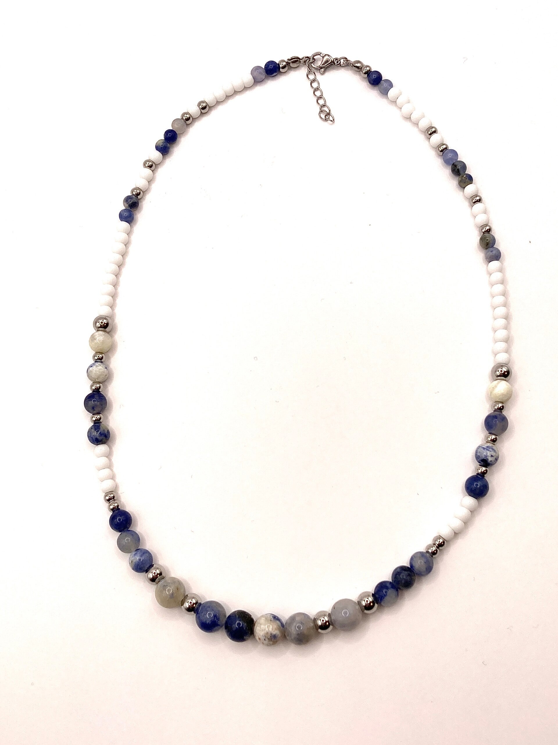 - Farbe: Edelstahl/ Silber, Sodalith: tiefe Blautöne, weiße Glasperlen