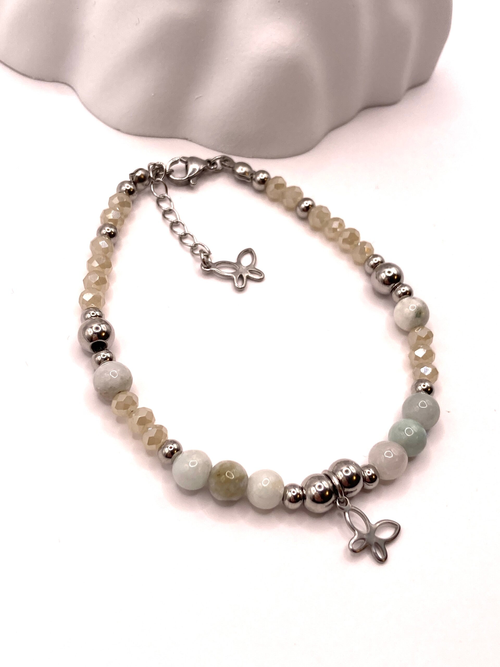 Entdecke die Leichtigkeit und Schönheit unseres exquisiten Armbands, das aus natürlichen Jadeit-Edelsteinen, facettierten Glasperlen und hochwertigem Edelstahl gefertigt ist. Dieses handgefertigte Schmuckstück vereint Eleganz und Natürlichkeit in perfekter Harmonie.